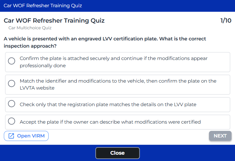 That is exactly why we built our Free WOF Inspector Refresher Training into the itsallauto.com eWOF platform. Every 2 months, you get free access to short Car, Trailer, and Motorcycle Multi-Choice Quizzes that improve and maintain your WOF knowledge.